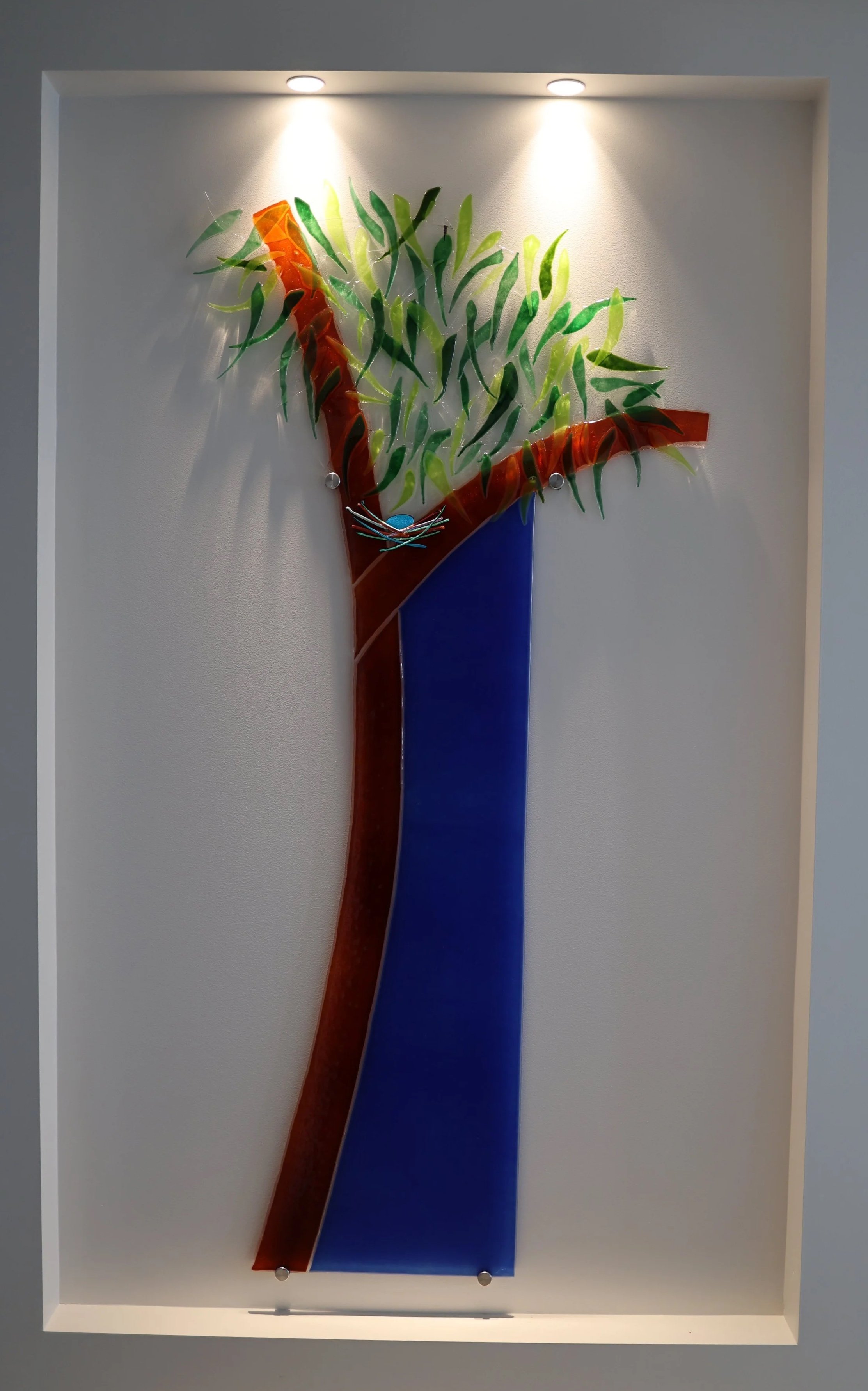 Having pieces commissioned or selected over time creates a particular intimacy — you learn how a work breathes with a room, how it changes with daylight, and how it joins the household. Preparing the alcoves specifically for these objects honours that relationship: the recess depth, sightlines and lighting were all considered to present them as a pair without forcing them into uniformity. The dress carries a decade of presence; the tree brings a fresh note. Together they form a small conversation in glass that references memory, continuity and renewal.